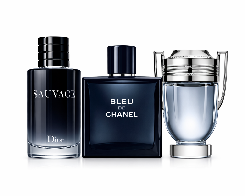 Kit composto por três perfumes masculinos de marcas internacionais: Sauvage Eau de Parfum de Dior, Bleu de Chanel e Invictus de Paco Rabanne, nas suas versões de maior capacidade.